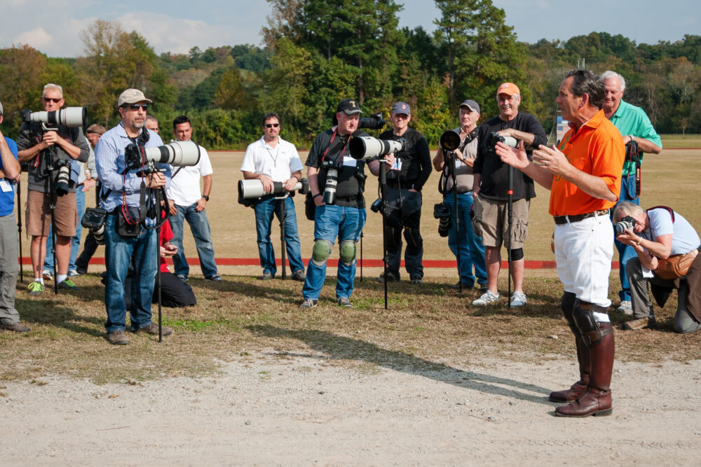 The participants were shooting pee-wee football, horse polo, soccer, and other sports, all while getting feedback from Peter and sports editors in real time on how to improve. Here’s a photo I have of him from that workshop (standing in orange hat), listening with the rest of the students on the rules of polo before a match: