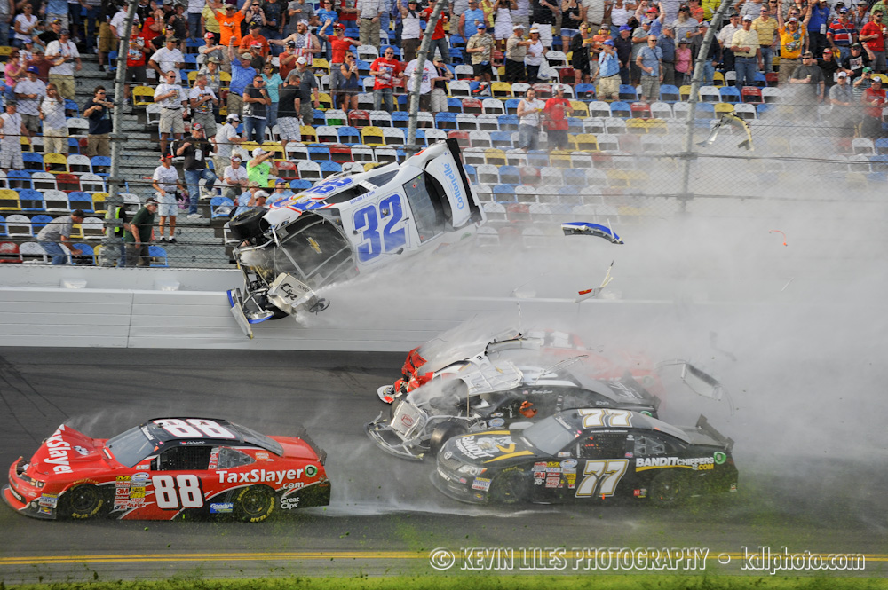 nascar_crash007 April 11, 2013 Kyle Larson crashes into the fence during the last lap of the NASCAR Nationwide race at Daytona International Speedway on Saturday, Feb. 23, 2013. Photo by Kevin Liles/kdlphoto.com