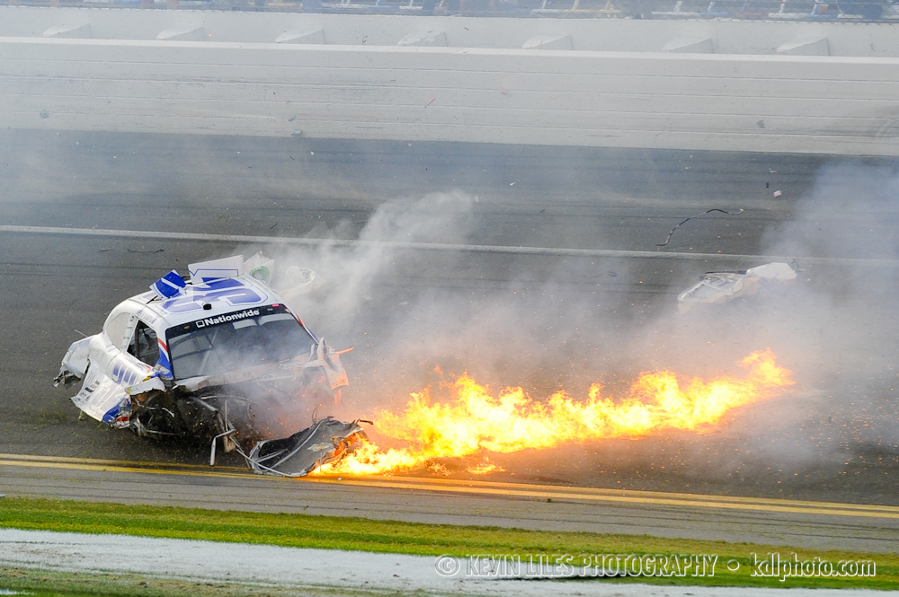 nascar_crash012 April 11, 2013 Kyle Larson crashes into the fence during the last lap of the NASCAR Nationwide race at Daytona International Speedway on Saturday, Feb. 23, 2013. Photo by Kevin Liles/kdlphoto.com
