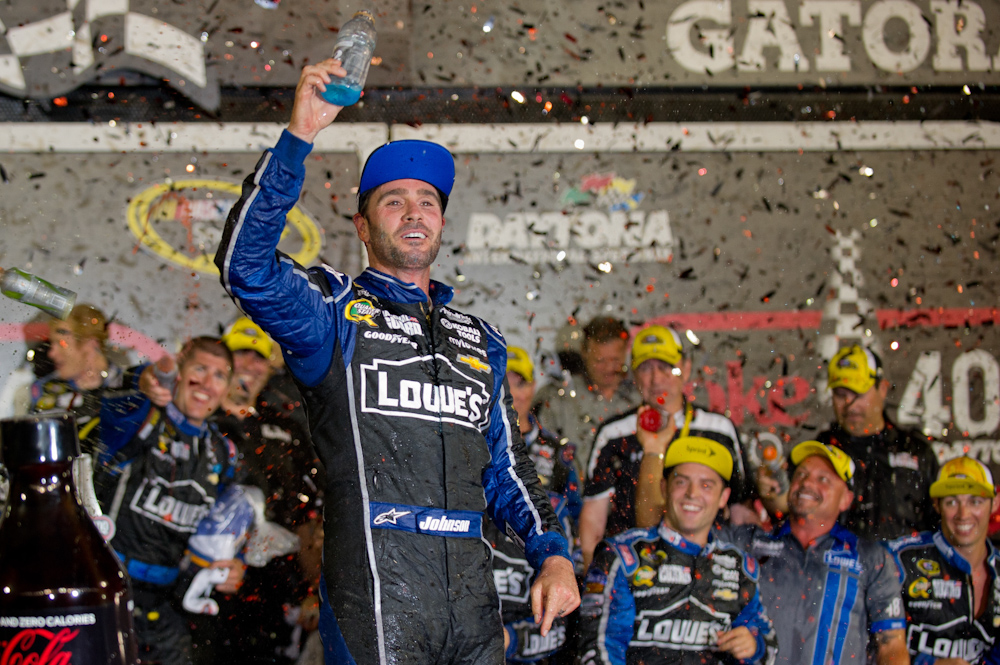 NASCAR Sprint Cup Series: Coke Zero 400 July 9, 2013 Jul 6, 2013; Daytona Beach, FL, USA; NASCAR Sprint Cup Series driver Jimmie Johnson (48) celebrates winning the Coke Zero 400 at Daytona International Speedway. Photo by Kevin Liles/kevindliles