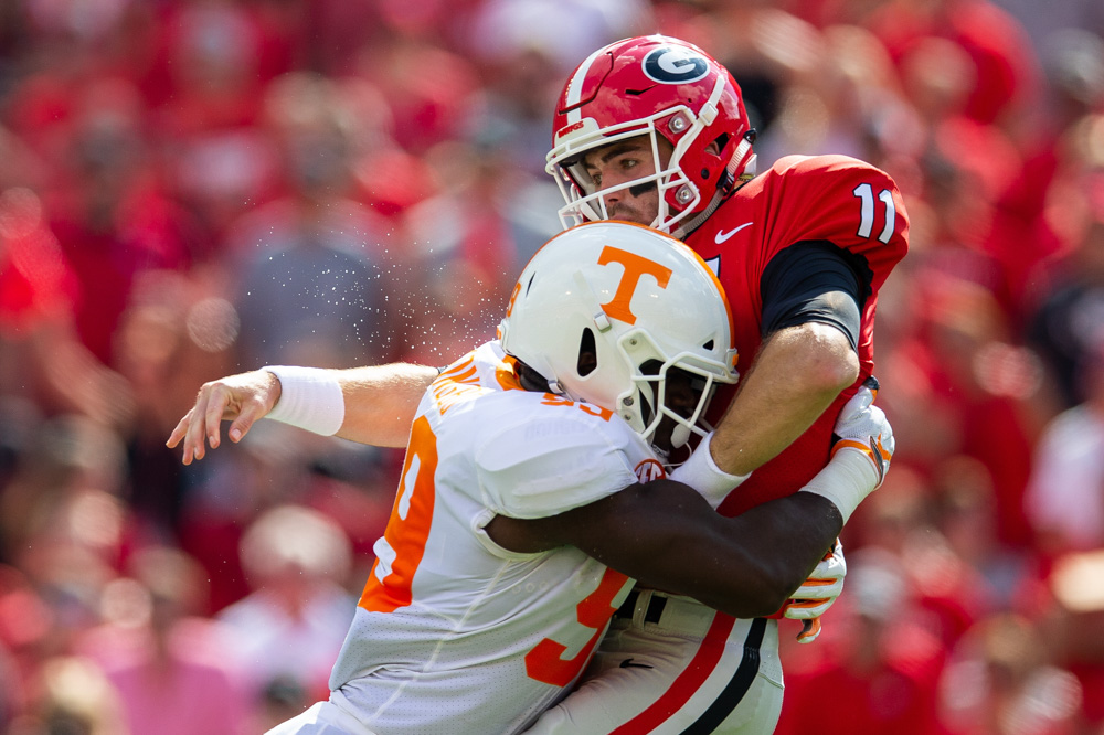 UGA Tennessee football December 28, 2018 University of Tennessee linebacker Jonathan Kongbo tackles UGA quarterback Jake Fromm at Sanford Stadium. Photographed for Sports Illustrated